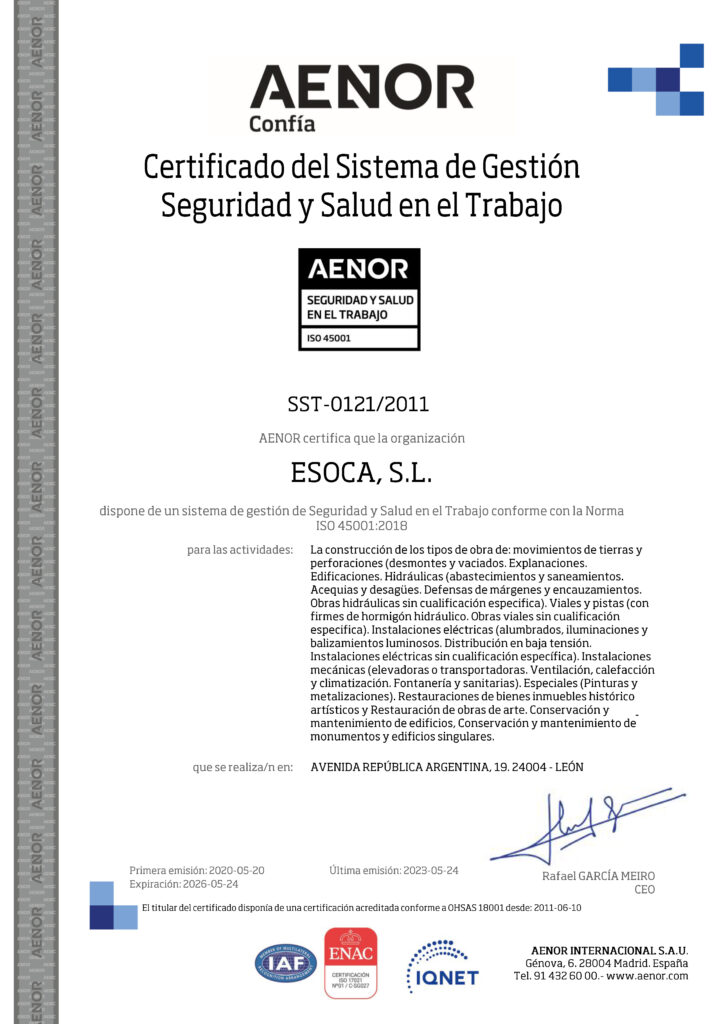 El objetivo principal de Esoca en materia de Seguridad y Salud es asegurar en todo momento un ambiente y condiciones de trabajo seguras para todas las personas que trabajan en la empresa: actuar para establecer un Sistema de Gestión que elimine o minimice los riesgos, asegure su conformidad con la política establecida y trate de mejorarlo de manera continua demostrando su conformidad con ISO 45001.